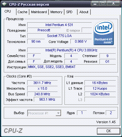 | Процессор (ядро) | Intel Pentium 4 (Prescott) |