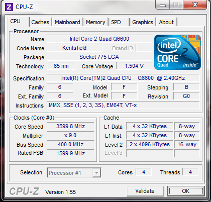 | Разгон, максимально стабильная частота (FSB x Ratio) | 3600 (400 x 9.0) |