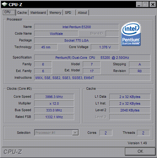 | Разгон, максимально стабильная частота (FSB x Ratio) | 3996 (333 x 12.0) |