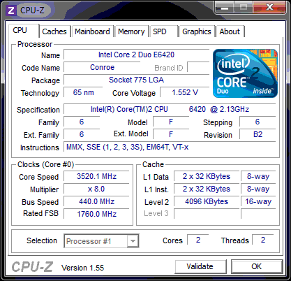 | Разгон, максимально стабильная частота (FSB x Ratio) | 3520 (440 x 8.0) |