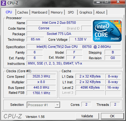 | Разгон, максимально стабильная частота (FSB x Ratio) | 3520 (440 x 8.0) |
