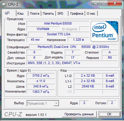 | Процессор (ядро) | Intel Pentium Dual-Core (Wolfdale-2M) |