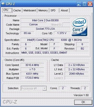 | Разгон, максимально стабильная частота (FSB x Ratio) | 3010 (430 x 7.0) |