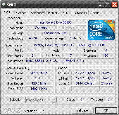| Разгон, максимально стабильная частота (FSB x Ratio) | 4018 (423 x 9.5) |