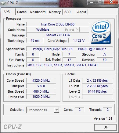 | Разгон, максимально стабильная частота (FSB x Ratio) | 4320 (480 x 9.0) |