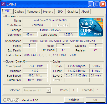 на крышке процессора: Q9450 SLAWY, по утилитам: Q9450S и CPU Thermal Design Power 65W... температура(по датчику на крышке процессора) в простое: ~32°, игры и приложения:~50°, OCCTv3.1.0 тест LINPACK:~62°... стабильно работает на 475x8 но MCH греется сильно. Память: DDR2-1100 Kingmax 2Gbx4 (1111MHz 6-6-6-12).