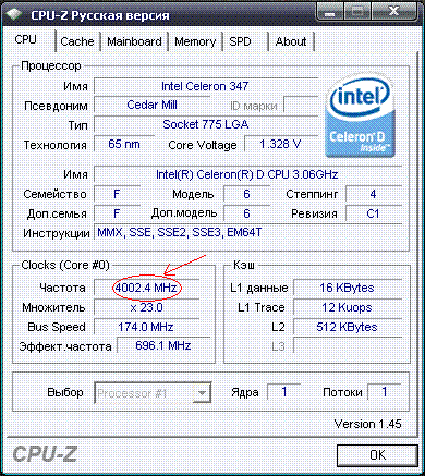 Результат разгона Intel Celeron D (CedarMill-512)