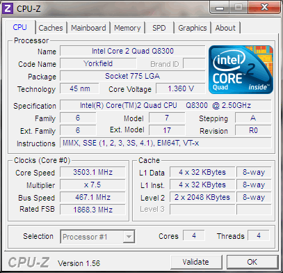 | Разгон, максимально стабильная частота (FSB x Ratio) | 3502 (467 x 7.5) |
