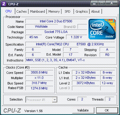 | Разгон, максимально стабильная частота (FSB x Ratio) | 3509 (319 x 11.0) |