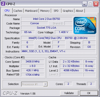 | Разгон, максимально стабильная частота (FSB x Ratio) | 3408 (426 x 8.0) |