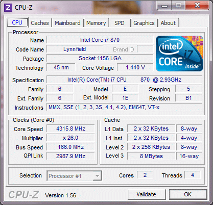 | Разгон, максимально стабильная частота (FSB x Ratio) | 4316 (166 x 26.0) |