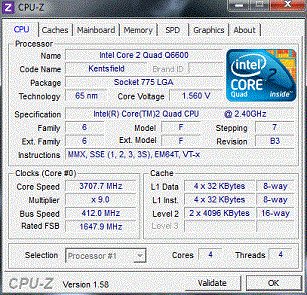 | Разгон, максимально стабильная частота (FSB x Ratio) | 3708 (412 x 9.0) |