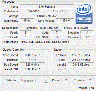 | Разгон, максимально стабильная частота (FSB x Ratio) | 3680 (320 x 11.5) |