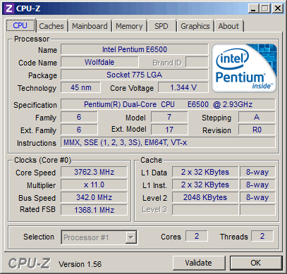 | Разгон, максимально стабильная частота (FSB x Ratio) | 3762 (342 x 11.0) |