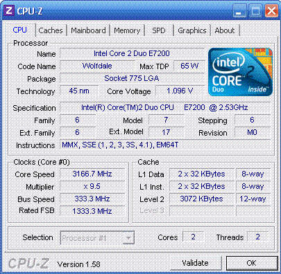 | Разгон, максимально стабильная частота (FSB x Ratio) | 3163 (333 x 9.5) |