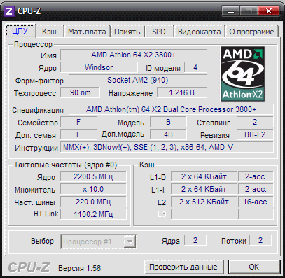 | Процессор (ядро) | AMD Athlon 64 X2 (Windsor) |