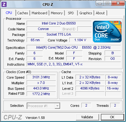 | Разгон, максимально стабильная частота (FSB x Ratio) | 3101 (443 x 7.0) |