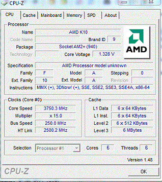Попался проц с маркировкой ADX640WFK42GR - это степинг E0 и основан на залоченном ядре шестиядерного фенома. Без разлочки - напруга по умолчанию - 1,25в, c разлочкой - 1,325. Поставил 1,35, разлочил - получился PhenomII X6, все тесты на ура на частоте 3750мгц, но тем-ру показывает нули - . больше гнать остерегся. радиатор кулера в основании под нагрузкой чуть теплый. Win7 32 - по процессору 7.6