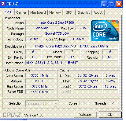 | Разгон, максимально стабильная частота (FSB x Ratio) | 3700 (370 x 10.0) |