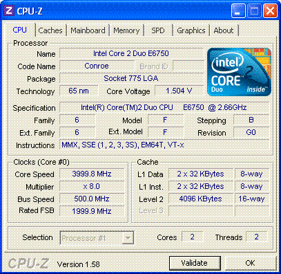 | Разгон, максимально стабильная частота (FSB x Ratio) | 4000 (500 x 8.0) |