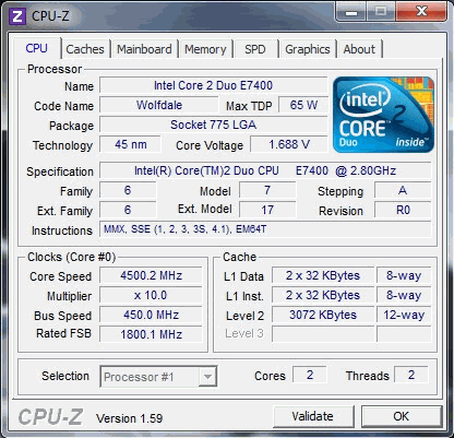 | Разгон, максимально стабильная частота (FSB x Ratio) | 4500 (450 x 10.0) |
