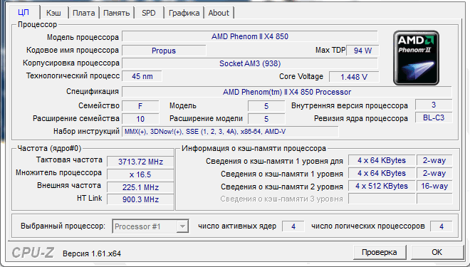 | Процессор (ядро) | AMD Phenom II X4 (Deneb) |