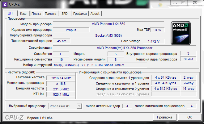 | Процессор (ядро) | AMD Phenom II X4 (Deneb) |