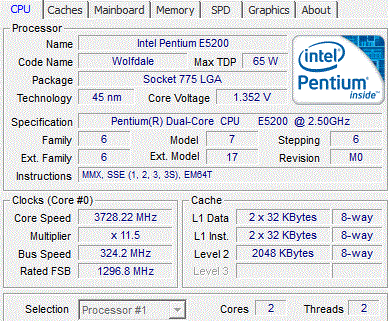 | Разгон, максимально стабильная частота (FSB x Ratio) | 3726 (324 x 11.5) |
