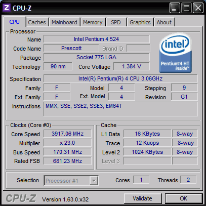| Процессор (ядро) | Intel Pentium 4 (Prescott) |