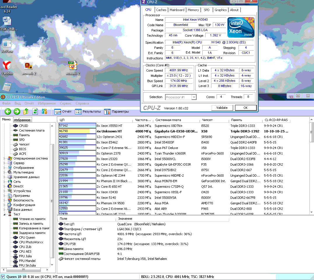 Это второй мой результат Для Этого проца (Xeon W3540 инженерный образец). Поставил шину 174 - при загрузке системы завис, поднял напругу с 1,376 до 1,392 - стал работать стабильно. Напругу можно поднять ещё, вероятно и частота увеличится, но на этом я закругляю свои эксперименты, мать уж больно не &экспериментная&, да и времени на всё это уходит много