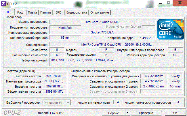 | Процессор (ядро) | Intel Core 2 Quad (Kentsfield) |