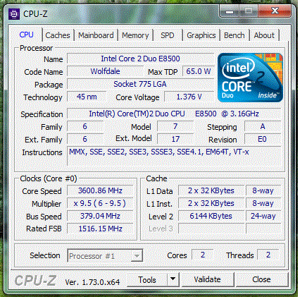 | Разгон, максимально стабильная частота (FSB x Ratio) | 3600 (379 x 9.5) |