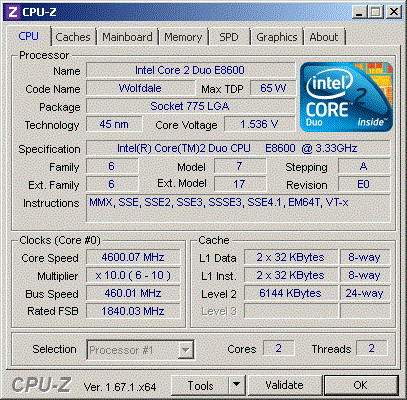 | Разгон, максимально стабильная частота (FSB x Ratio) | 4600 (460 x 10.0) |