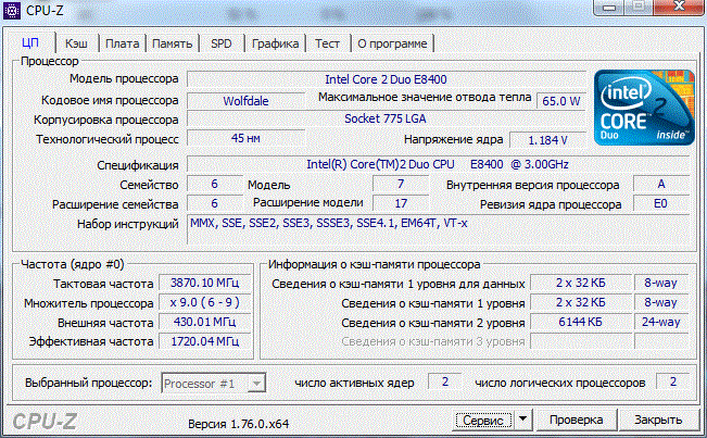 | Процессор (ядро) | Intel Core 2 Duo (Wolfdale) |