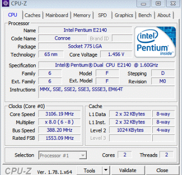 | Разгон, максимально стабильная частота (FSB x Ratio) | 3104 (388 x 8.0) |