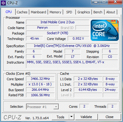 Сделан BSELmod для запуска на FSB800, ибо GM965 чипсет, а у проца FSB1066, иначе не стартует. Множитель можно ставить из биоса, но хитро, сначала выставить нужный, потом перегрузиться и поставить на auto, иначе выставляет множитель 6. На шине 800 половинчатые множители почему-то ставить не хочет, пришлось поднять до 1066 при помощи SetFSB. Напряжение пинмодом не поднимал, максимум в TrottleStop