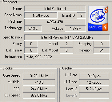 | Разгон, максимально стабильная частота (FSB x Ratio) | 3172 (244 x 13.0) |