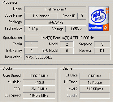 | Разгон, максимально стабильная частота (FSB x Ratio) | 3393 (261 x 13.0) |