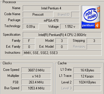| Процессор (ядро) | Intel Pentium 4 (Prescott) |