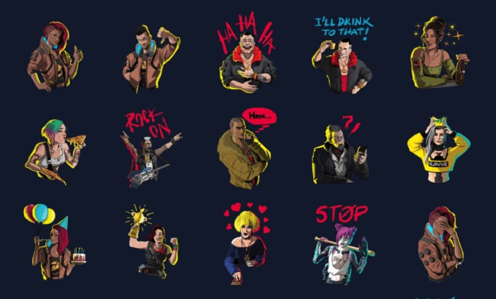 В стикерах вы сможете найти рисунок по душе: две версии ВИ (мужская и женская), Панам Палмер, Джонни Сильверхенд, Джеки Уэллс, Бестия Амендиарес и другие. Разработчики в данной ситуации посчитали нужным пошутить насчёт того, что после установки стикер-пака пользователи смогут выражать свои эмоции «как настоящие киберпанки».