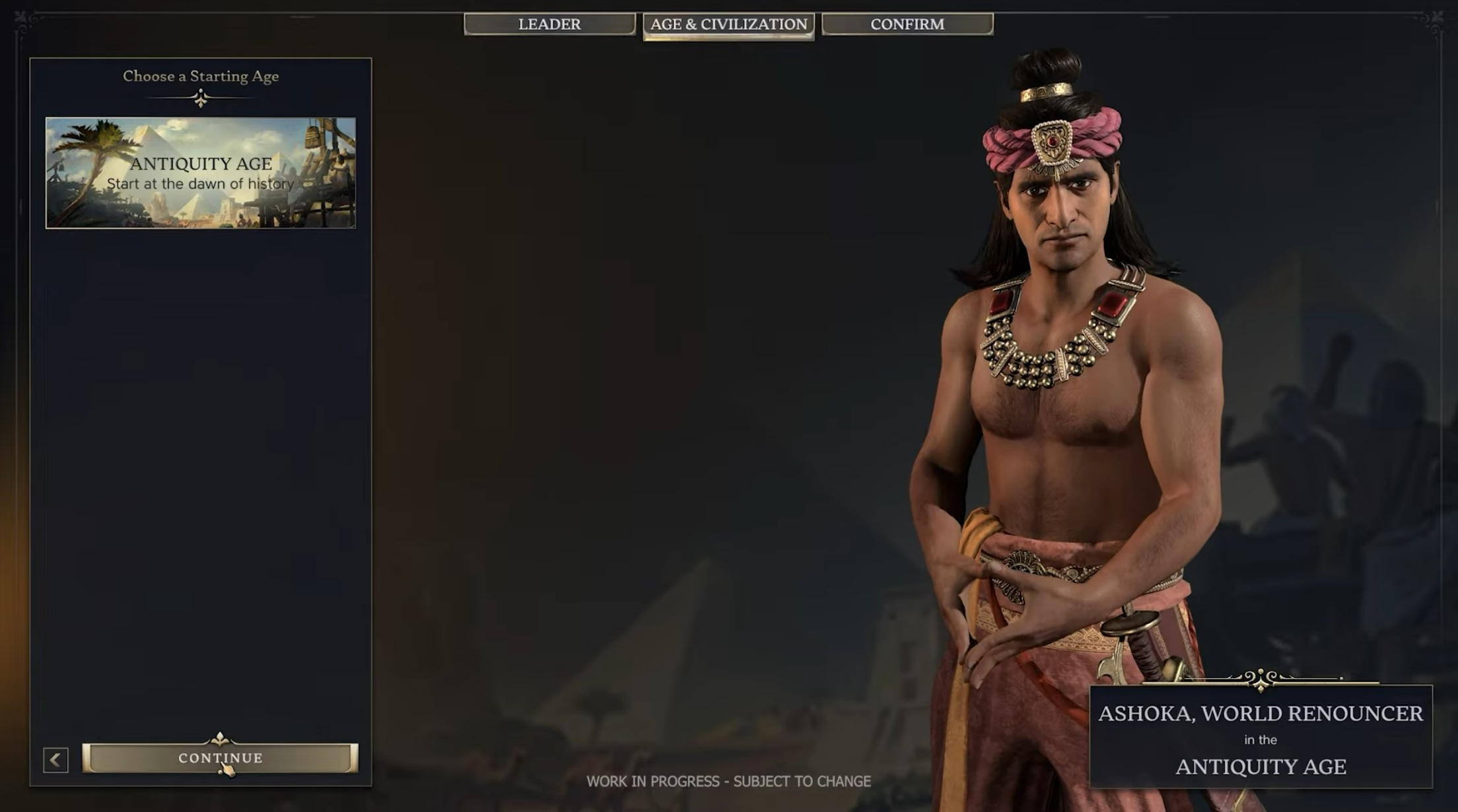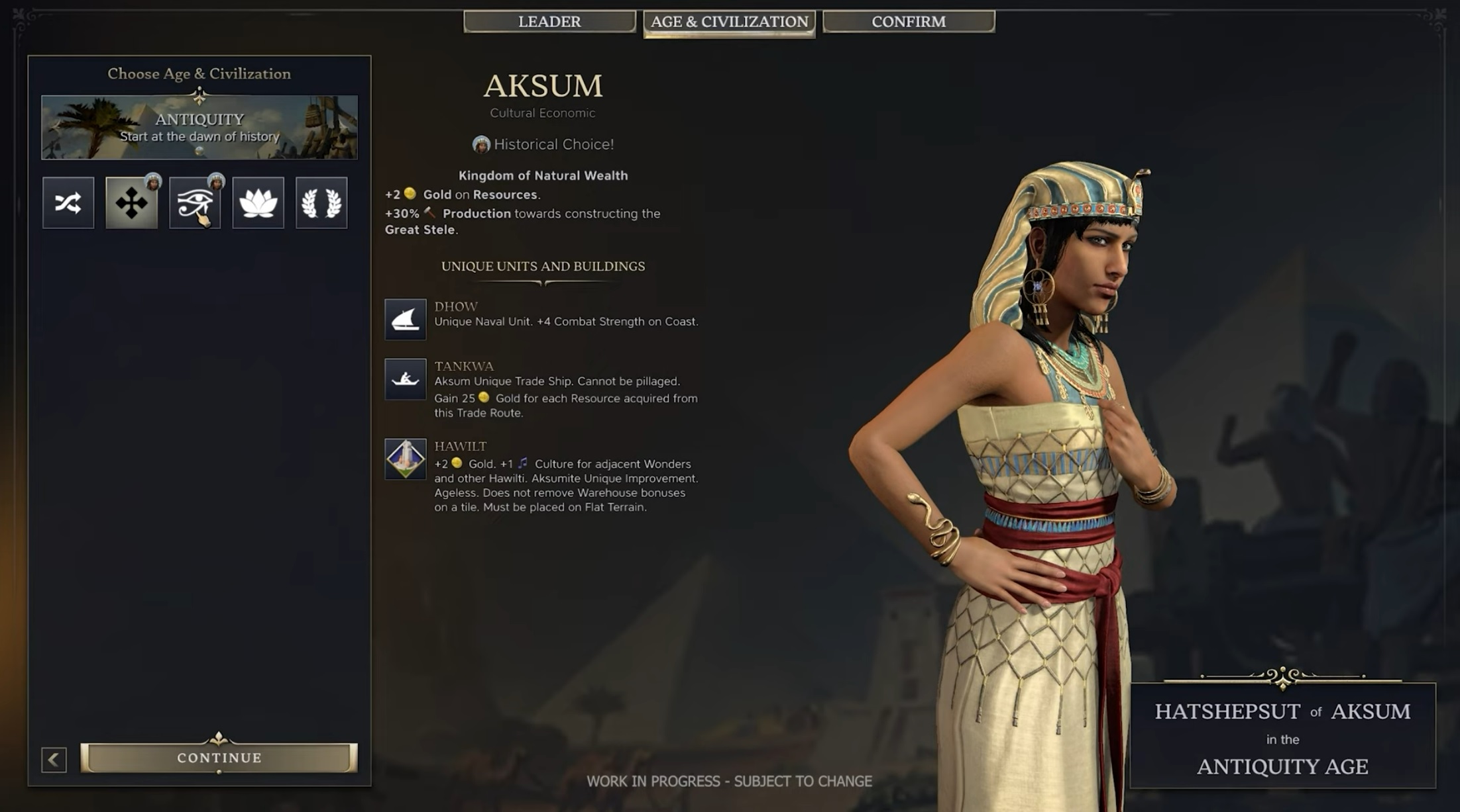 Реализована система будет частично по принципу 4X-стратегии Humankind от Amplitude Studios. Начинать путешествие мы будем с исторического прообраза нашей цивилизации, которая затем будет меняться по мере продвижения по эпохам, превращаясь в конечном счёте в некий современный вариант государства. Лидером цивилизации при этом может быть любой из представленных в игре, так что, условно говоря, Октавиана Августа вполне можно заставить руководить Древним Египтом. По мере научного и культурного развития наша цивилизация будет наследовать различные заработанные бонусы, которые могут как сочетаться, так и противоречить запланированному стилю игры, так что развивать цивилизацию следует разумно.