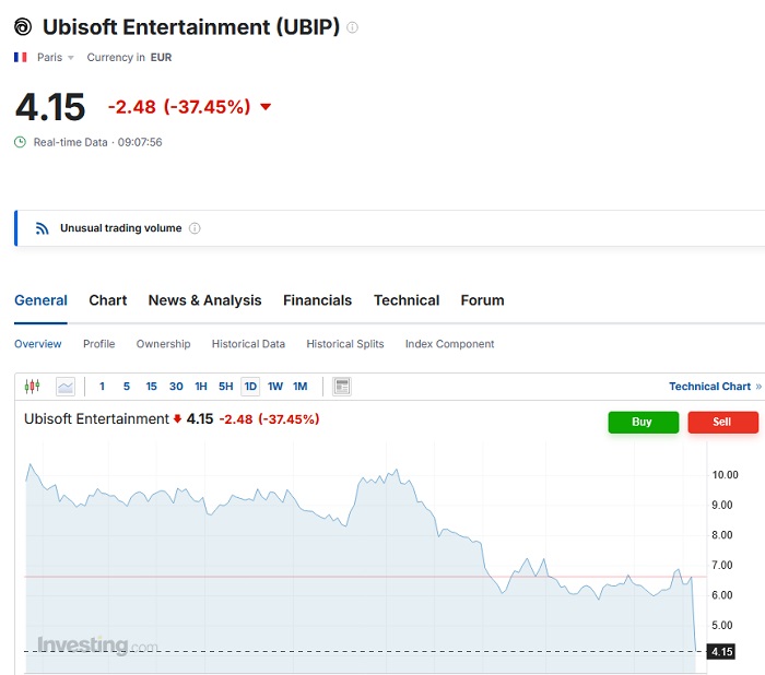 Всё это, как вы прекрасно понимаете, не могло самым пагубным образом не отразиться на финансовых показателям Ubisoft. Как следует из информации на портале Investing.com, стоимость акций французского игрового издательства за сутки обвалилась более чем на 37%. По данным агентства Reuters, это сильнейшее суточное падение стоимости акций французского издательства после его появления на бирже в 1996 году.