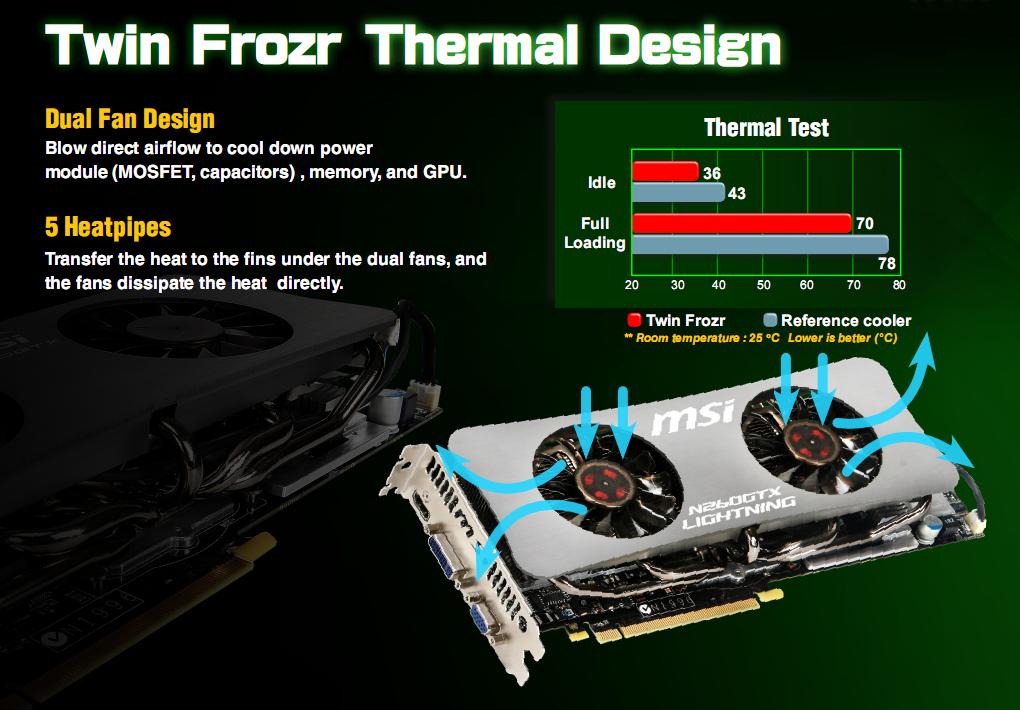 Также из отличительных черт необходимо отметить наличие удвоенного объёма видеопамяти – 1792 Мб, и систему охлаждения оригинальной конструкции, использующую 5 тепловых трубок и пару вентиляторов классической конструкции.