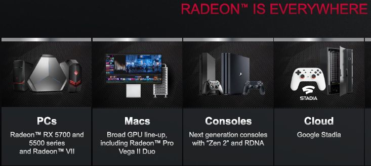 В новой версии презентации для инвесторов компания AMD упоминает об архитектуре графических решений RDNA преимущественно в привязке к игровым видеокартам Radeon RX 5700 и Radeon RX 5500, а также игровым консолям Sony и Microsoft 2020 модельного года. В последнем контексте компания почему-то предпочитает умалчивать, что графика «заказных» решений успеет эволюционировать до второго поколения архитектуры RDNA, хотя ещё в сентябре об этом говорилось открыто.