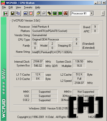 Сбылись мои предсказания относительно разгоняемости Pentium 4 1.6A на платформе с DDR-памятью. Если вы помните, я тогда писал, что вместо Pentium 4 2.2 ГГц вполне можно использовать его разогнанного 1.6 ГГц собрата. Ну так вот, парни с [H]ardOCP взяли Pentium 4 1.6A, кулер AVC Sunflower, мат. плату ABIT BD7-RAID(i845D), память Corsair XMS2400 и получили систему, устойчиво работающую на 2.18 ГГц.