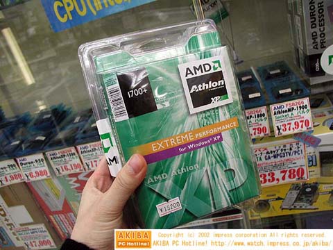 Обратите внимание на цвет процессора - теперь он зеленый. Такой он потому, что при производстве процессора использовалась новая упаковка - OPGA (Organic Pin Grid Array). Отличается она от прежней толщиной (новая тоньше) и тем, вместо керамики используется пластмасса. Процессор Athlon XP 1700+ в Retail-варианте стоит 19200 йен (примерно 144 доллара США).