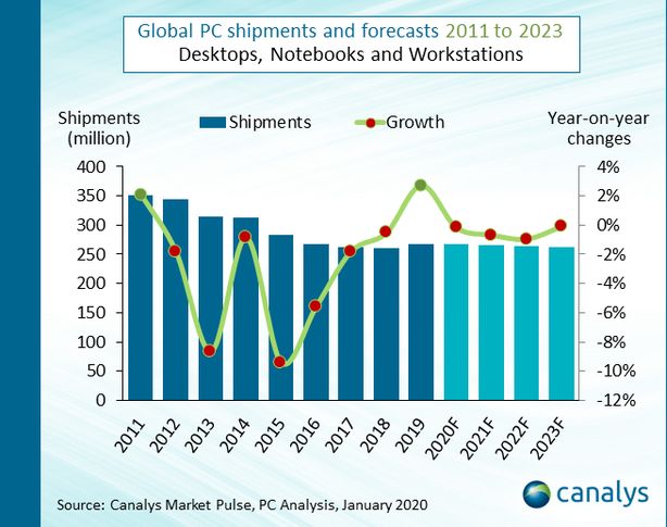 Если в прошлом году объёмы реализации ПК выросли на 2,7%, то в этом году они окажутся ниже прошлогоднего уровня. Более того, как считают авторы прогноза, к росту рынок не вернётся до 2023 года, хотя и не указывает, какие факторы этому будут способствовать. В 2020 году на ключевых рынках типа США, Японии и Индии спрос будет вялым, неопределённости добавит ситуация вокруг сделки HP Inc. и Xerox. Устройства с поддержкой 5G и мобильные компьютеры со складным гибким дисплеем обретут популярность через два-три года, по мнению аналитиков Canalys.