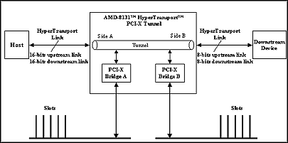 С хостом это устройство соединяется 16-битной шиной HyperTransport с пропускной способностью 6.4 Гб/с,а вот со ледующем в "цепочке" девайсом (Downstream device) - 8-битной с пропускной способностью 3.2 Гб/с. Таким образом, данные проходят как бы через "туннель", где от них отбирается нужная часть. Поэтому устройство и называется "туннель". Устройство включает в себя два PCI-X моста, каждый из которых: