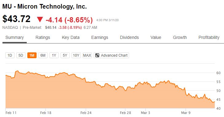 В ближайшее время цены на память будут расти, как отмечает автор аналитической записки. Этому не смогут противодействовать даже тенденции по снижению спроса на память в других сегментах рынка. Прогноз по курсу акций Micron повышен до $63, но в действительности он пока только снижается – до $43,72 на последних торгах, и это явно не предел.