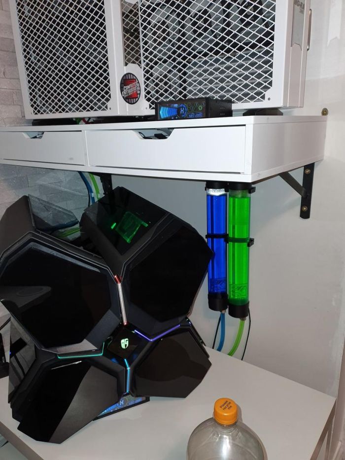 Судя по скудной иллюстрации, собранная энтузиастом система жидкостного охлаждения оснащается крупным радиатором с целой батареей вентиляторов – такой при необходимости можно выставить на балкон или в другую зону с доступом прохладного воздуха.